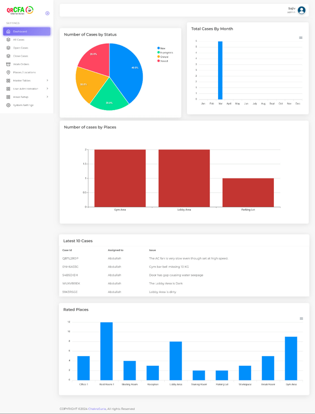 With the QR code on Strategic locations within a building or on objects like toilet cubicles, Aircons and even smaller objects like a projector, when something is faulty or not working, a scan and case can be opened and routed to relevant personal to take action and case can be tracked until closure. Facilities department can track all this ti closire guaranteeing quick closure and efficient management.